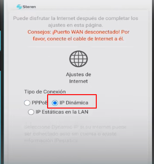 IP dinámica Steren Nombre y contraseña Wifi Steren - Conecta nuevamente tu dispositivo a la red de Steren: Al ingresar un nuevo nombre y contraseña, deberás acceder nuevamente a la red del router Steren con el nombre y la contraseña actualizada. Luego actualiza la página de configuración de Steren.
