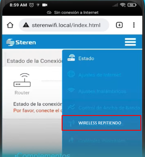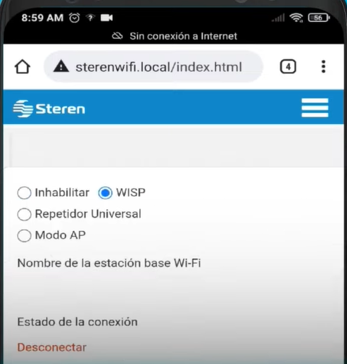 - Selecciona la opción de repetidor universal: Dentro de la página de configuración de Steren presiona el menú y selecciona la opción de «wireless reptiendo» la opción de «Wisp«.